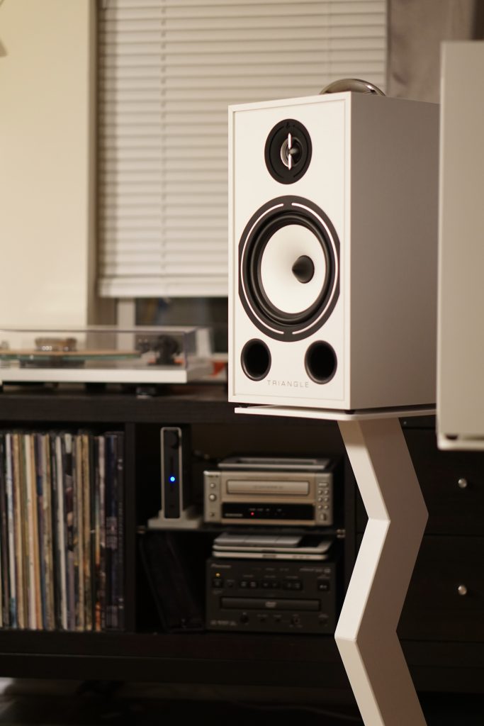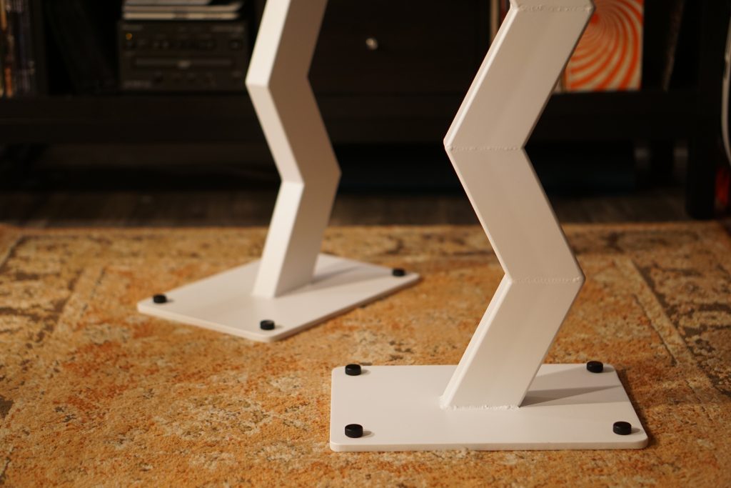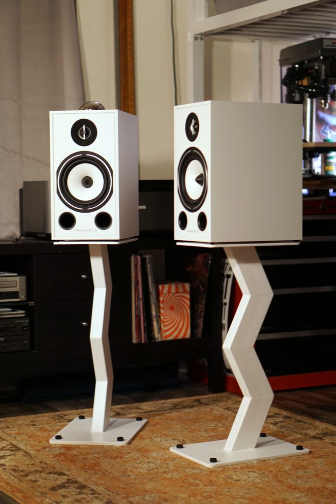 I built these speaker stands around two years ago. I designed them to complement my Triangle BR03 speakers. They are made entirely of mild steel and then powder coated. I used pulse TIG for most of the fabrication, which was thoroughly enjoyable. The bottom plate is 3/8 inch thick and the top is 1/4 inch thick. They feature adjustable feet machined from delrin plastic.
